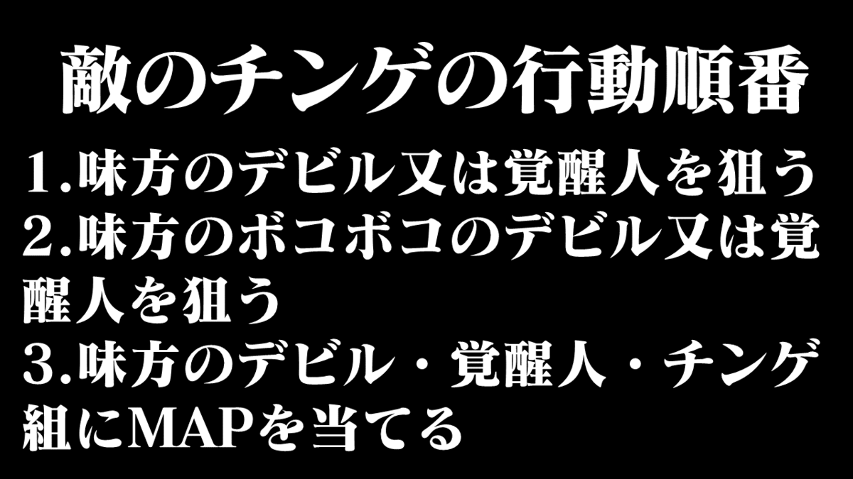 チンゲ3ターン目のMAPですが、たまに前半でも奇襲を使うチンゲもいますが、その場合、覚醒人がいなかったらきっとAI的に多数にMAPを当てたくて(3体以上)移動して後ろを狙うはずですが、覚醒人という存在のおかげで、あと3ターンは生き残るデビルマンのおかげで、MAPが当たる味方の機体が前方に3体いるため、後ろまで行かずそのまま打った方が多かったです。