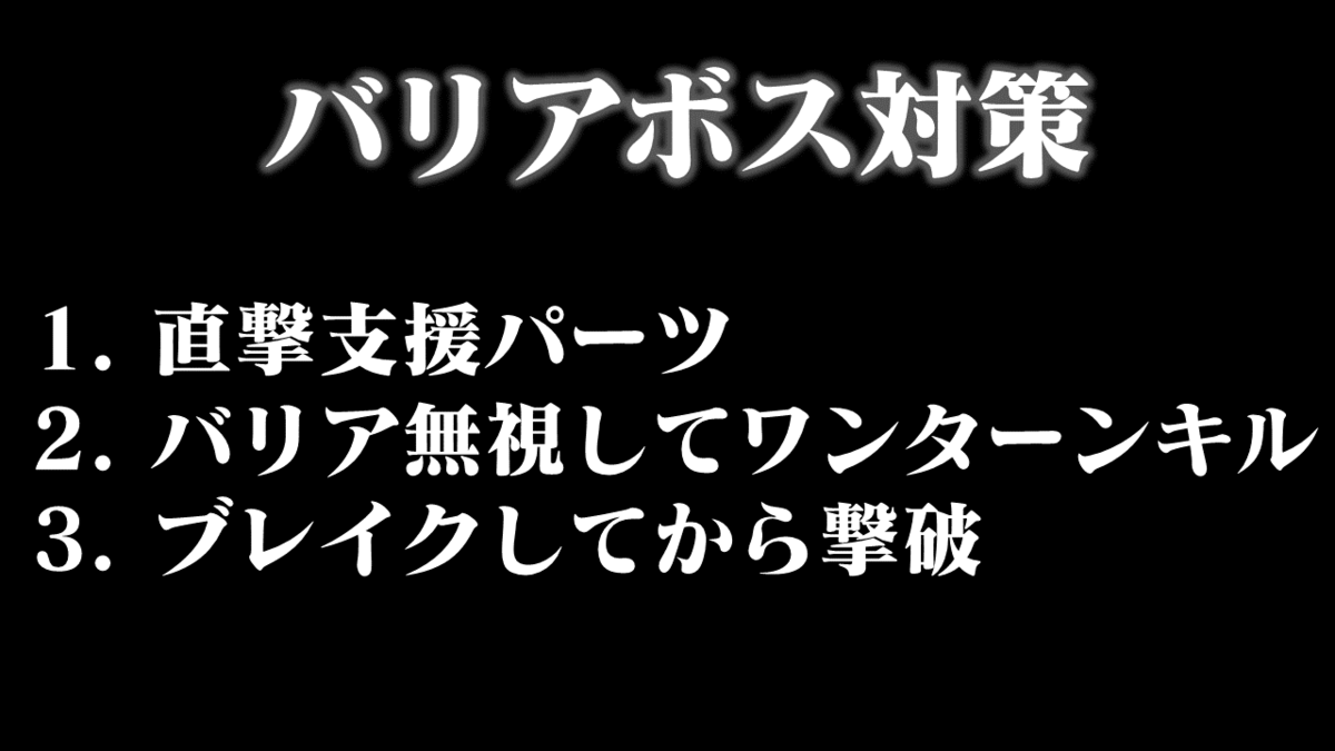 それで、またバリアボスが今回みたいに多く出る可能性があるため、支援パーツを用意するか、ブレイクに気を付けるかでしょうね。
