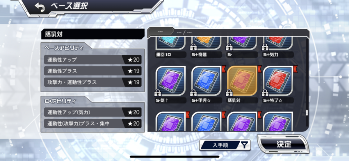 もちろん、自分の胚乳のスペックに合わせてチップを使うのが一番正しいかと思います。無理やりに2MAPを使うのはあんまりおすすめできませんね。例えば、運動性が最大3,000ほどであれば、①のような運動性寄りチップを付けて4~5,000まで上げたりするのが正しいでしょうね。